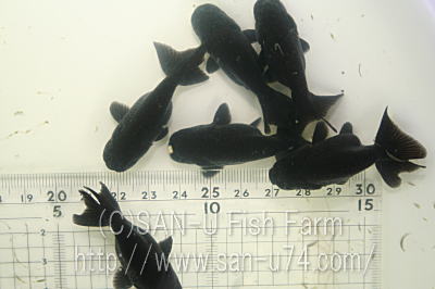 グレードAA。ご当地金魚なので大きなぶれはないでしょう。安心して到着が待てる品種です。AAなのでお腹まで真っ黒。1.5イチンは小さいので腹付きは控え目。 |