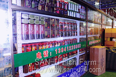 小袋の餌専門店。お菓子の問屋のような光景でした。 |