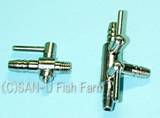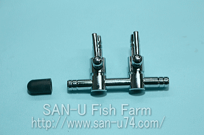 業務用エアーポンプと4×6mmホースとを接続するのに便利な分岐管。エアーの量が調節できる。