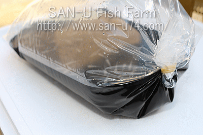 水を入れてパッキングすると、底が四角に広がって丸物の金魚を入れるのに適している。