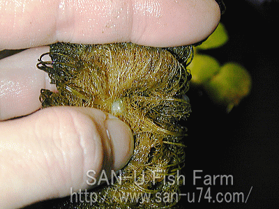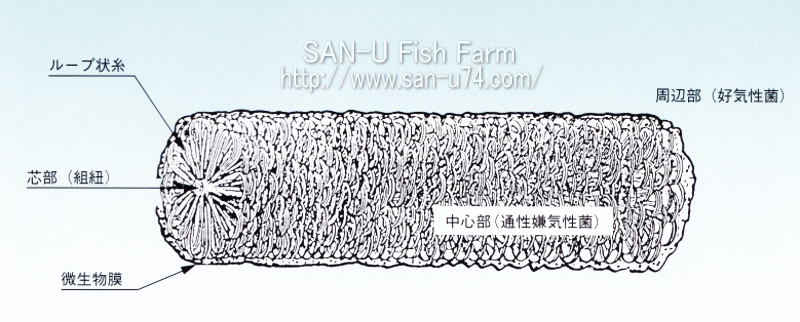 活性汚泥が付きすぎて、ループが潰れないように、透明ナイロンが骨材の役目を果たします。 |